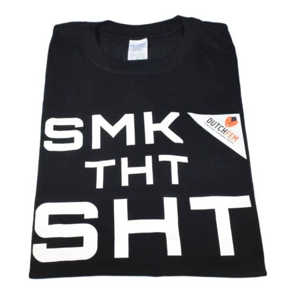 Dutchfem black unisex T-shirt featuring the white SMK THT SHT slogan. This black short sleeve unisex T-shirt is the perfect addition to any Dutchfem fan wardrobe. 100% organic cotton that won’t harm the environment and ensures complete comfort. Available in S, M, L and XL.