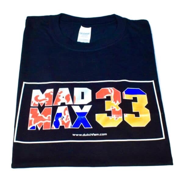 Schwarzes Unisex-T-Shirt von Dutchfem mit dem roten, weißen, blauen und orangefarbenen MadMax # 33-Slogan. Dieses schwarze Unisex-T-Shirt mit kurzen Ärmeln ist die perfekte Ergänzung für jeden Dutchfem- und MadMax # 33-Liebhaber-Kleiderschrank. 100% Bio-Baumwolle, die die Umwelt nicht schädigt und für vollen Komfort sorgt. Erhältlich in S, M, L und XL. Auch in weißem T-Shirt erhältlich.