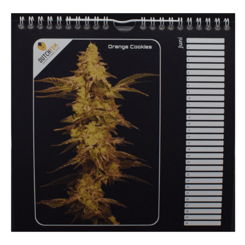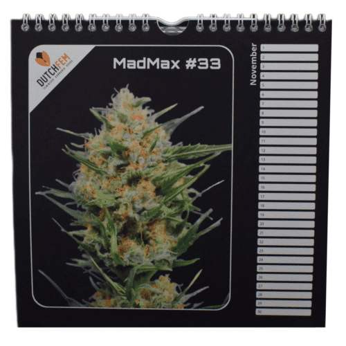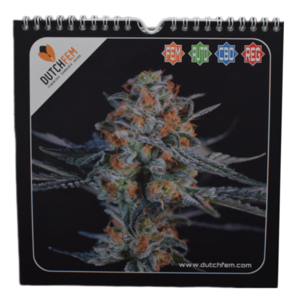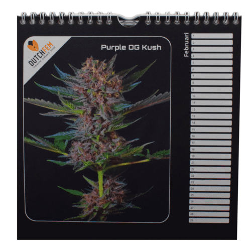 Mooie full color Dutchfem verjaardagskalender met foto’s van onze bestverkopende feminized cannabis soorten, Madmax #33, Gelato Olandese, Orange Cookies, Purple OG Kush, Northern Light Special en vele andere.
