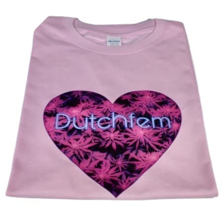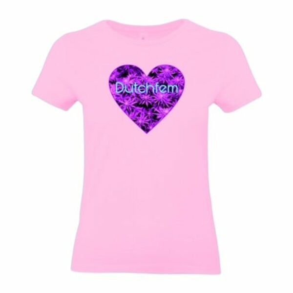 Dit roze dames-T-shirt is gemaakt van 100% biologisch katoen en is niet alleen stijlvol, maar ook milieuvriendelijk. Op de voorkant van het T-shirt vind je een prachtig paars hartje met cannabis print en de naam van je favoriete zadenbank in felblauwe neon letters.